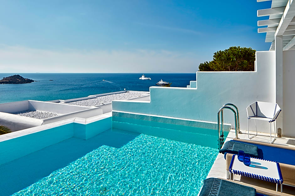 Indulge in luxury at the Thalassa Suite with Private Pool, featuring a terrace, soundproof walls, and a private bathroom with a bathtub. The suite accommodates 3 adults and 1 child, ensuring a comfortable stay for your family.