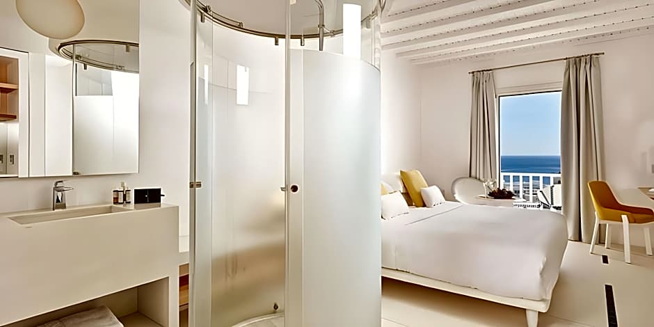 THALASSA Suite Private Pool & Sea View is 484 square feet and includes either 2 single beds 80-130 width or a king-size bed 150-183 width plus hairdryer.